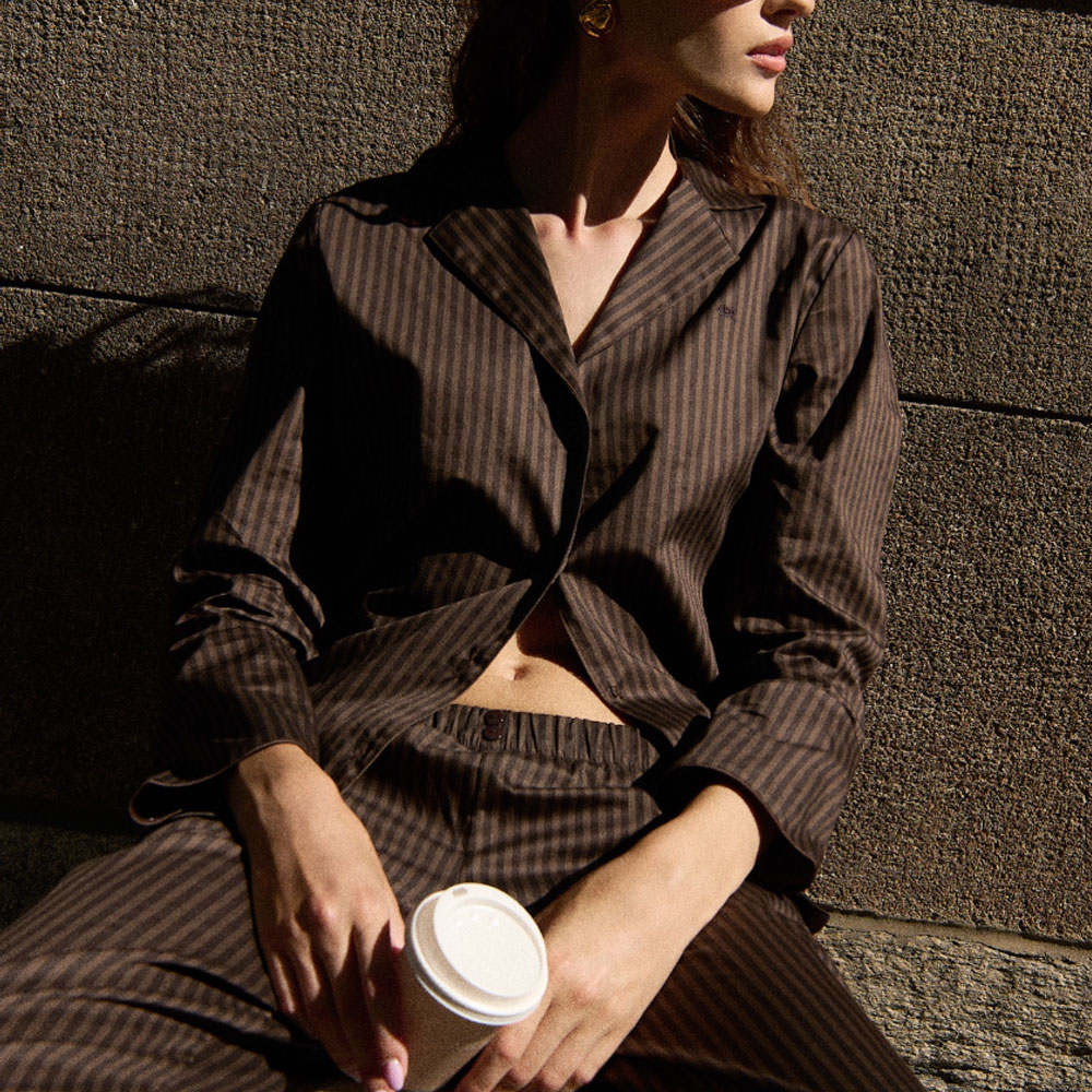 Εξαιρετικό, κομψό και πολυτελές σετ πιτζαμών με λάστιχο στη μέση για άνεση. Κατασκευασμένο από γυαλιστερό βαμβακερό ύφασμα ποπλίνας. Το πάνω μέρος διαθέτει κλασικό σχέδιο σε στυλ πουκάμισου με λεπτομέρειες στα μανίκια και ασορτί καφέ κέντημα στο στήθος. Το παντελόνι είναι σε ίσια γραμμή με πλαϊνές τσέπες και ρίγες στο κάτω μέρος. Η μέση είναι κομψά διακοσμημένη με κουμπιά.