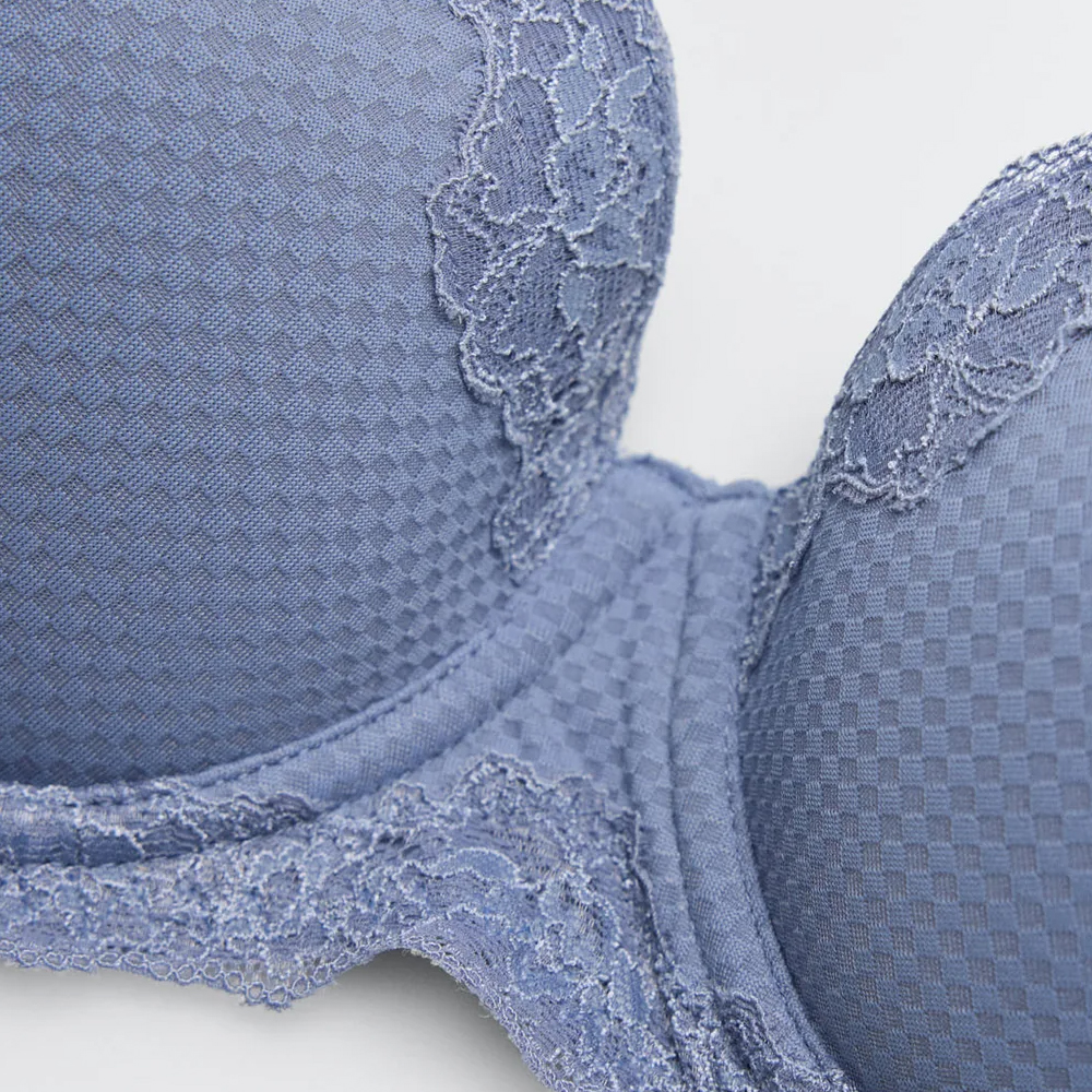 Σουτιέν με μπανέλα και ανάγλυφη επένδυση από ζακάρ ύφασμα. Λεπτομέρειες δαντέλας. Ντελικάτο και κομψό.